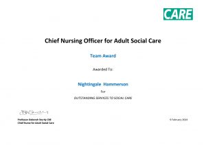 Nightingale Hammerson has been awarded the Chief Nursing Officer for Adult Social Care Team Award for ‘Outstanding Services to Social Care.’
